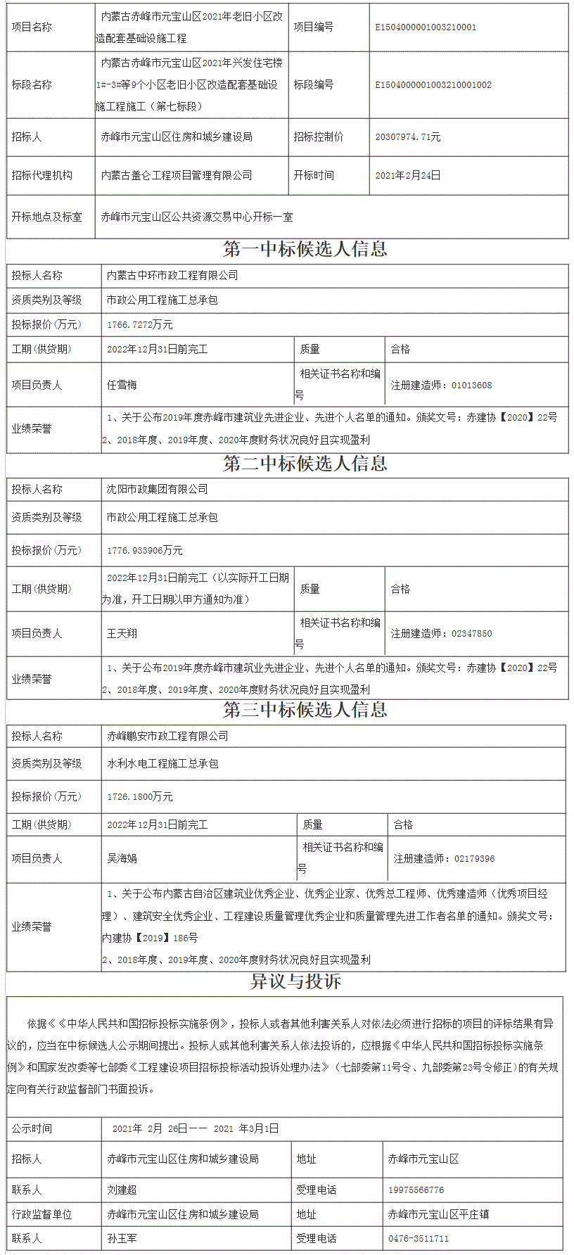 •       内蒙古赤峰市元宝山区2021年兴发住宅楼1#-3#等9个小区老旧小区改造配套基础设施工程施工(第七标段)招标评标工作已结束,依据评标委员会的评标报告,发布中标候选人公示如下: