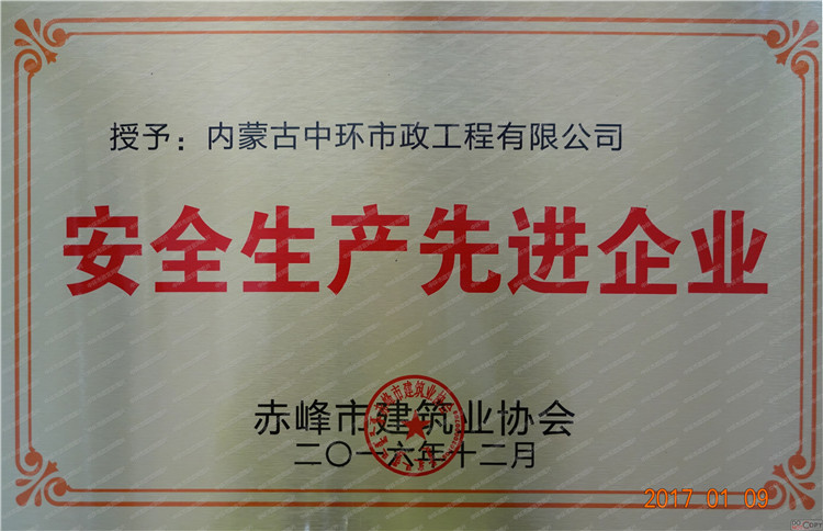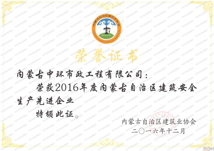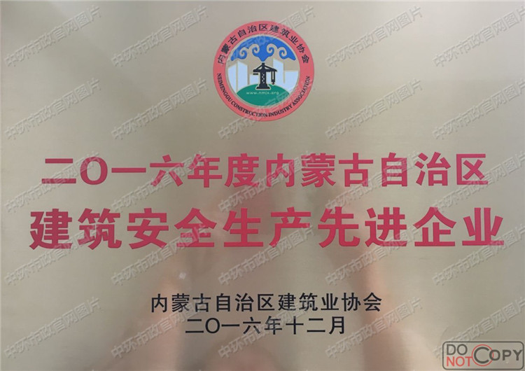 自治区安全生产先进企业荣誉证书