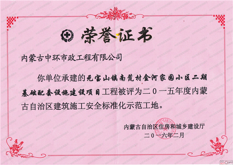 自治区级标准化工地荣誉证书