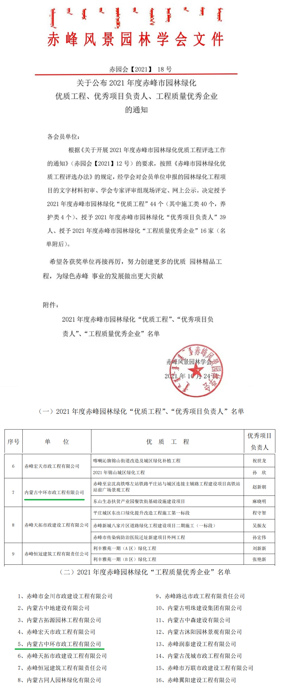 内蒙古中环市政工程有限公司被评为园林绿化工程质量优秀企业