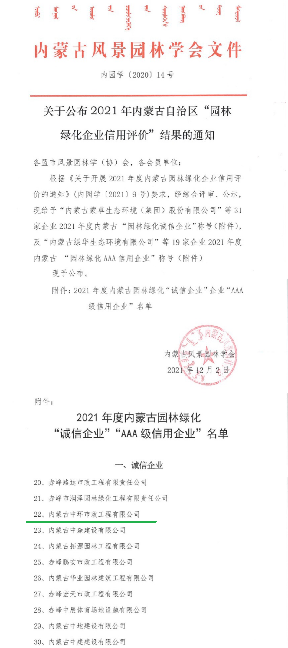 中环市政被评为内蒙古园林绿化“诚信企业”