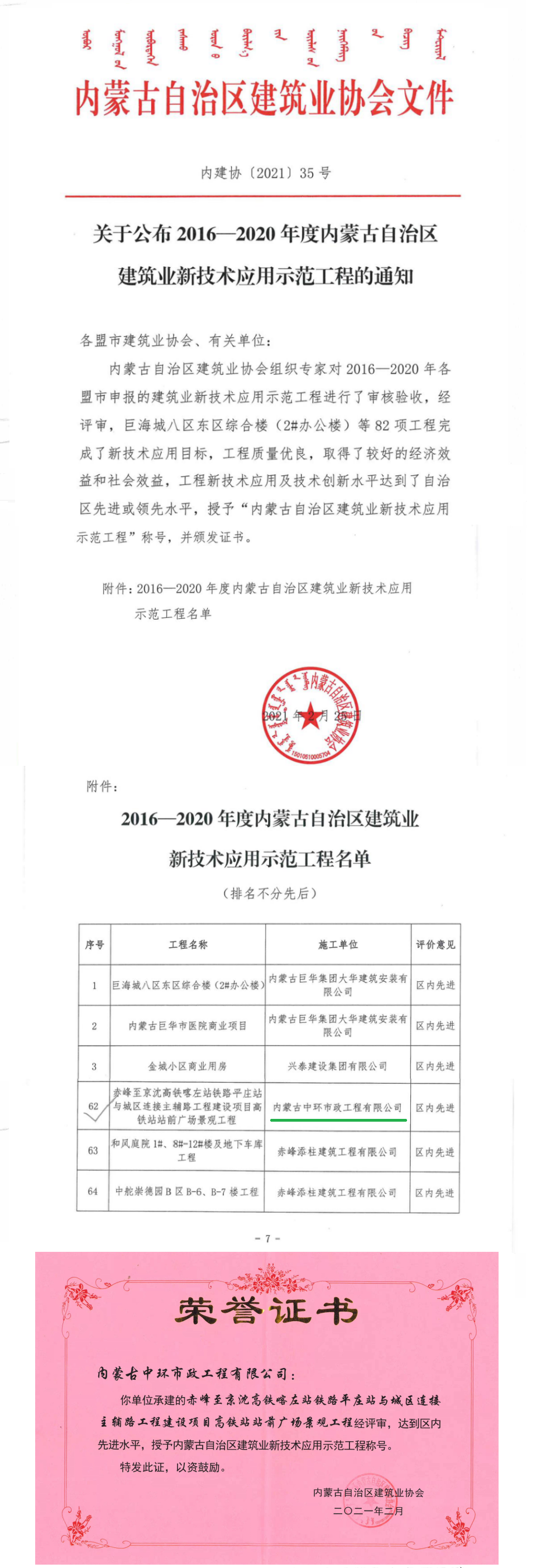 内蒙古中环市政工程有限公司1项工程获得内蒙古建筑业新技术应用示范工程