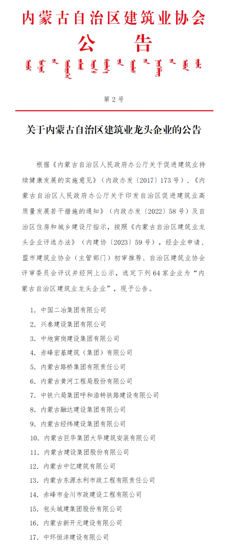 根据《内蒙古自治区人民政府办公厅关于促进建筑业持续健康发展的实施意见》(内政办发(2017)173号)、《内蒙古自治区人民政府办公厅关于印发自治区促进建筑业高质量发展若千措施的通知》(内政办发(2022)58号)及自治区住房和城乡建设厅指示,按照《内蒙古自治区建筑业龙头企业评选办法》(内建协(2023)59号),经企业申请、盟市建筑业协会(主管部门)初审推荐、自治区建筑业协会评审委员会评议并经网上公示,中环恒沣建设有限公司、中国二治集团有限公司、兴泰建设集团有限公司、中地寅岗建设集团有限公司等64家企业被评为“内蒙古自治区建筑业龙头企业”,现子公告。
