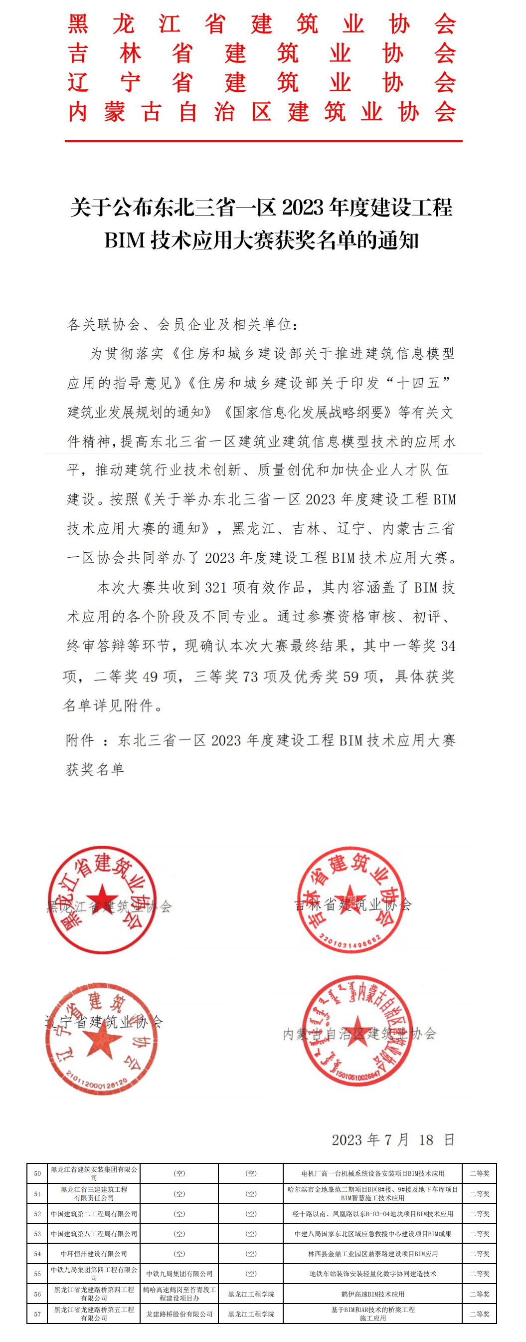 为贯彻落实《住房和城乡建设部关于推进建筑信息模型应用的指导意见》《住房和城乡建设部关于印发“十四五”建筑业发展规划的通知》《国家信息化发展战略纲要》等有关文件精神,提高东北三省一区建筑业建筑信息模型技术的应用水平,推动建筑行业技术创新、质量创优和加快企业人才队伍建设。按照《关于举办东北三省一区2023年度建设工程BIM技术应用大赛的通知》,黑龙江、吉林、辽宁、内蒙古三省一区协会共同举办了2023年度建设工程BIM技术应用大赛。本次大赛共收到321项有效作品,其内容涵盖了BIM技术应用的各个阶段及不同专业。通过参赛资格审核、初评项,二等奖49项,三等奖73项及优秀奖59项,具体获奖名单详见附件。