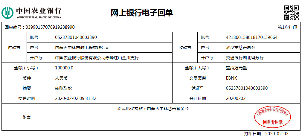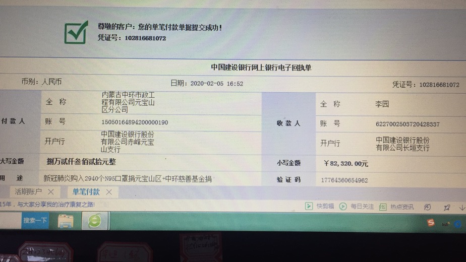 新型冠状病毒肺炎疫情阻击战打响以来,为支援一线抗击疫情,彰显企业担当,内蒙古中环市政工程有限公司于2月2日向武汉市慈善总会捐助善款100000元,紧急驰援武汉;同时向元宝山区防疫指挥部捐赠82320元紧急购买N95口罩2940个,用于新型冠状病毒肺炎疫情防控,以实际行动践行社会责任。